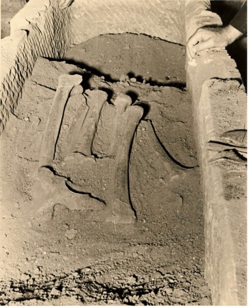 La photo prise au cours des fouilles de 1951 en fait la plus belle démonstration. On y voit très nettement le sarcophage positionné sous presque un mètre de pierrailles, exactement dans l’axe de la fausse tombe… CQFD !