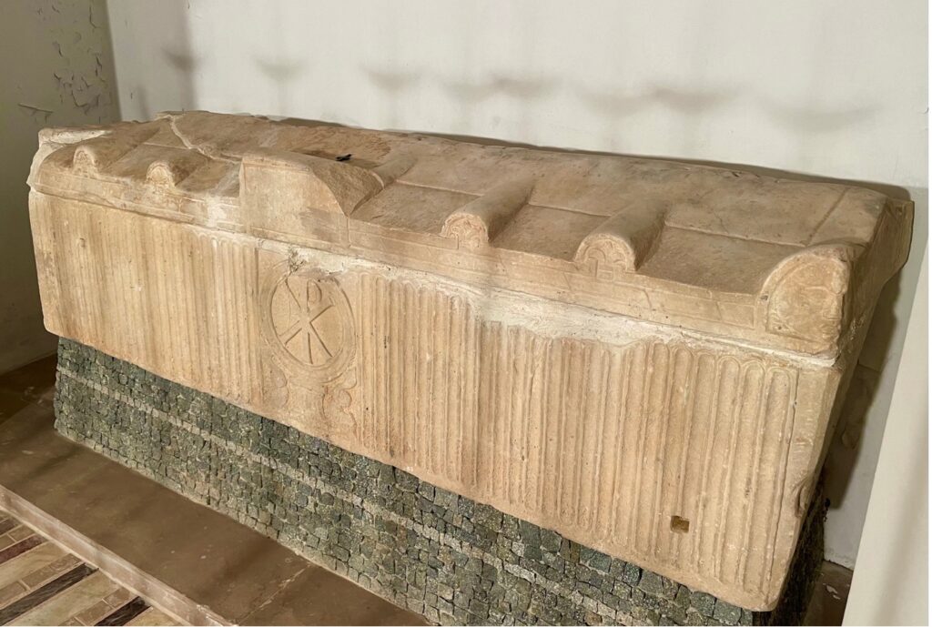 Certains détails du chrisme circulaire sculpté en creux, au centre de la cuve du sarcophage indiquent qu’il date d’avant le début du IV° siècle, donc il est logique de le retrouver à l’époque de la vie de Restituta.