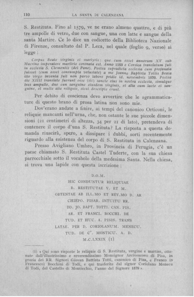 conservé à Pise. C’est un fait que sur deux de ces quatre os, deux furent donnés à Castel Tuderte durant l’année 1579, comme reliques de Ste. Restitude de Sora et non comme de Ste. Restitude de Calenzana. C’est un fait également que l’Archidiocèse de Pise eut adopté dans son Proprio, un office en l’honneur de Ste. Restitude de Sora.